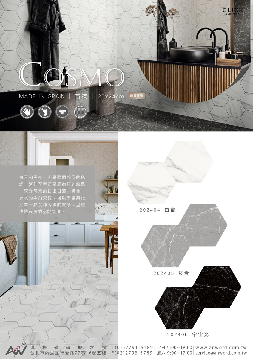 白天和黑夜,亦是兩個相反的色調,延伸至宇宙星辰微粒的紋路,感受每天的日出日落,體會一次次的黑白交錯,可以千變萬化又帶一點沉穩內斂的質感,呈現典雅浪漫的空間氛圍。