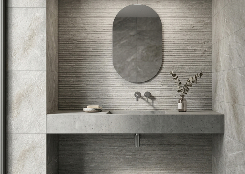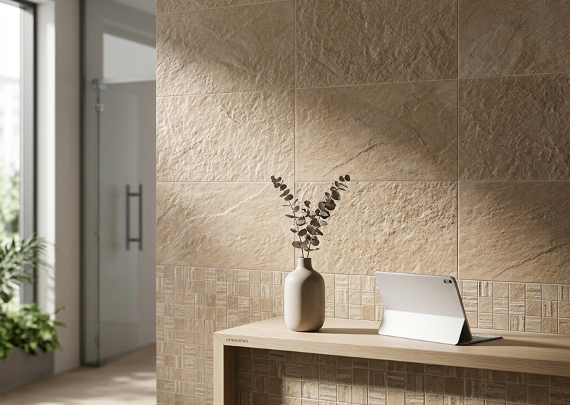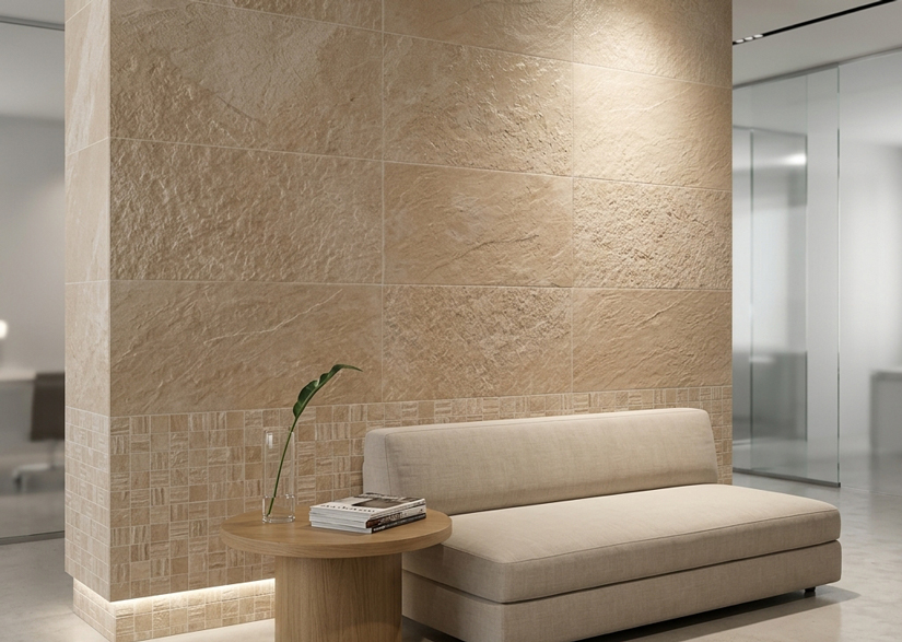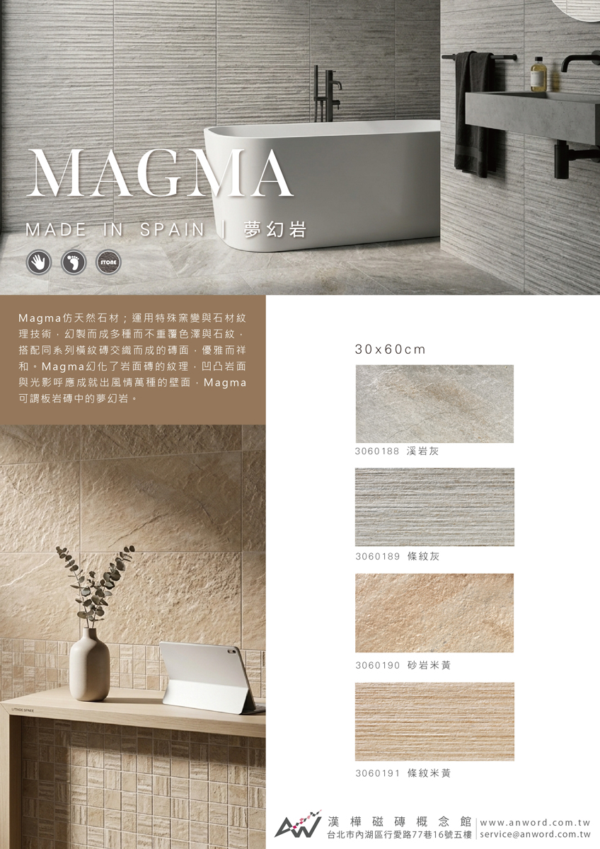 Magma仿天然石材;運用特殊窯變與石材紋理技術,幻製而成多種而不重覆色澤與石紋,搭配同系列橫紋磚交織而成的磚面,優雅而祥和。Magma幻化了岩面磚的紋理,凹凸岩面與光影呼應成就出風情萬種的壁面,Magma可謂板岩磚中的夢幻岩。