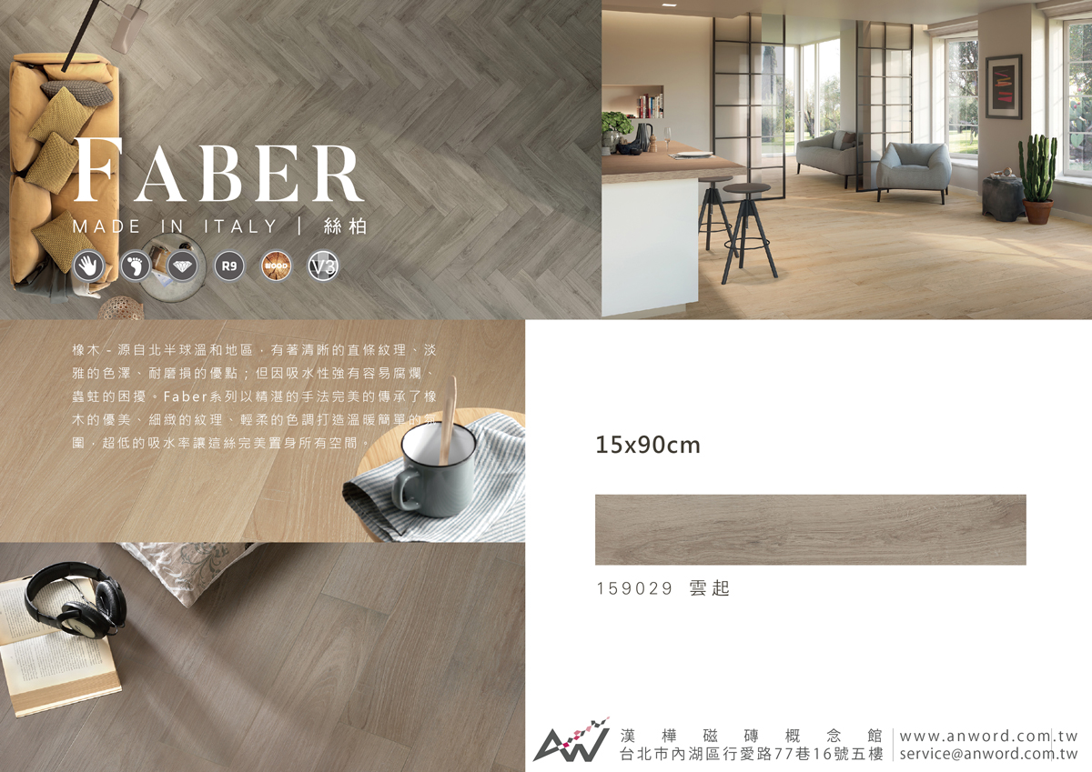 橡木--源自北半球溫和地區,有著清晰的直條紋理、淡雅的色澤、耐磨損的優點;但因吸水性強有容易腐爛、蟲蛀的困擾。Faber系列以精湛的手法完美的傳承了橡木的優美、細緻的紋理、輕柔的色調打造溫暖簡單的氛圍,超低的吸水率讓這絲完美置身所有空間。