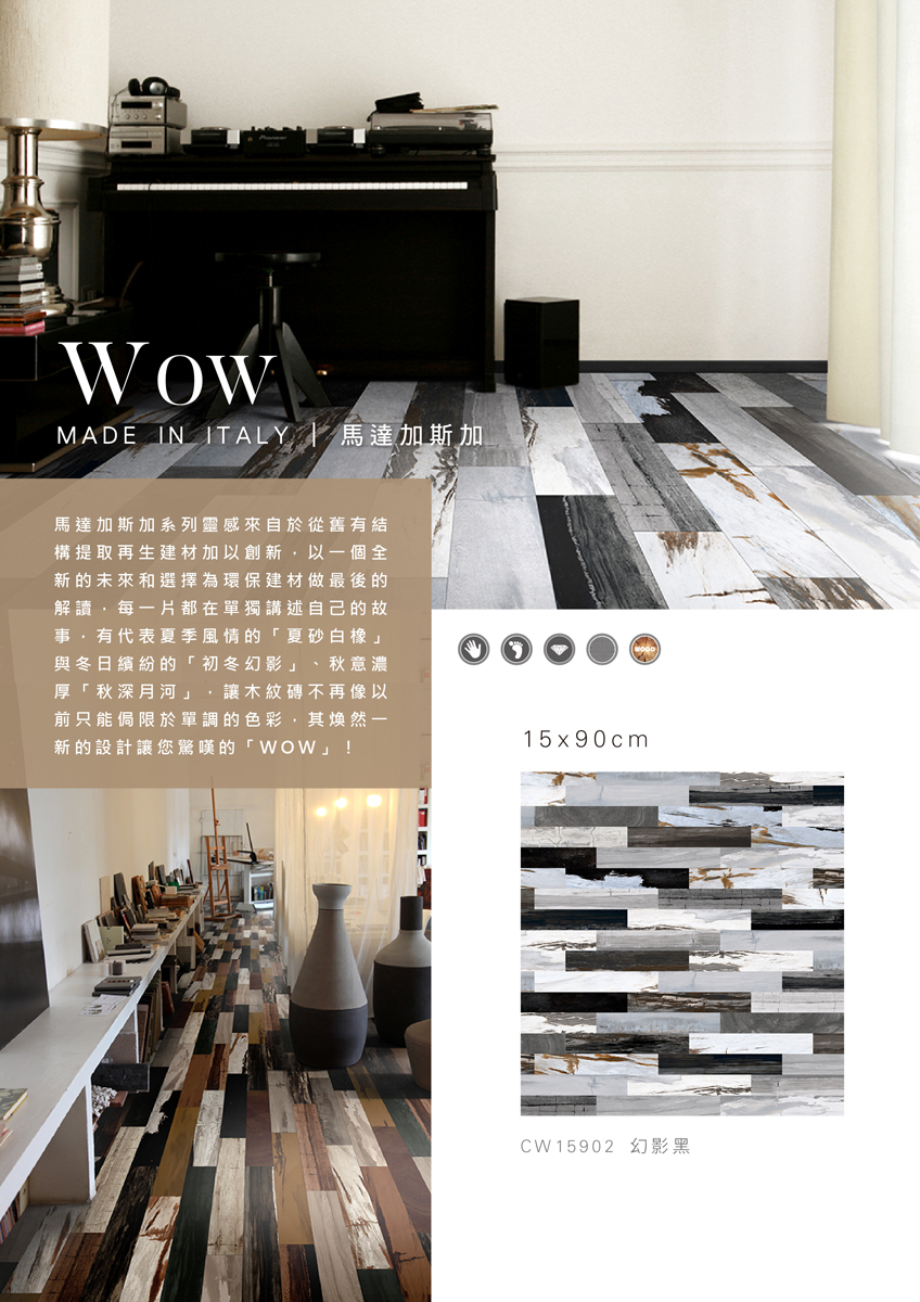 馬達加斯加系列靈感來自於從舊有結構提取再生建材加以創新,以一個全新的未來和選擇為環保建材做最後的解讀,每一片都在單獨講述自己的故事,有代表夏季風情的「夏砂白橡」與冬日繽紛的「初冬幻影」、秋意濃厚「秋深月河」,讓木紋磚不再像以前只能侷限於單調的色彩,其煥然一新的設計讓您驚嘆的「WOW」!