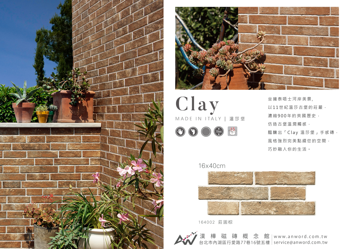 坐擁泰晤士河畔美景,以11世紀溫莎古堡的莊嚴,濃縮900年的英國歷史,仿造古堡石牆溫潤觸感,醞釀出「溫莎堡Clay」手感磚,風格強烈完美點綴您的空間,巧妙融入您的生活。