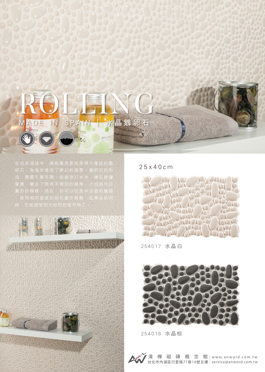 在沿岸海域中,總能看見那些美得不像話的鵝卵石,為海岸增添了夢幻的風景。鵝卵石的形成,需要千萬年間,經過浪打水沖,礫石碰撞摩擦,磨去了原有不規則的稜角,才成為今日圓形的模樣。現在,你可以在家中浴室的牆面,使用相同面感的卵石當作裝飾,在淋浴的同時,也能感受到大自然的鬼斧神工。