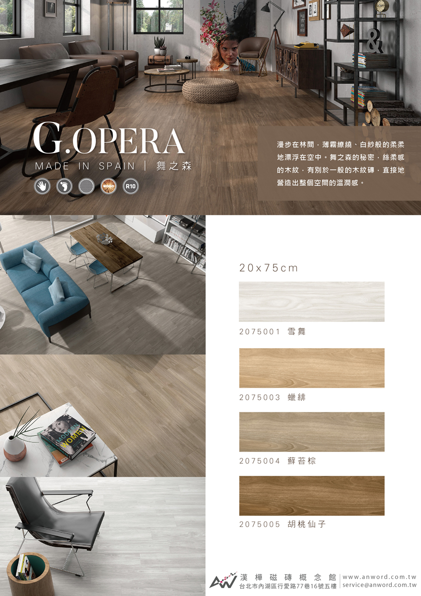 漫步在林間,薄霧繚繞、白紗般的柔柔地漂浮在空中。 舞之森的秘密,絲柔感的木紋,有別於一般的木紋磚,直接地營造出整個空間的溫潤感。