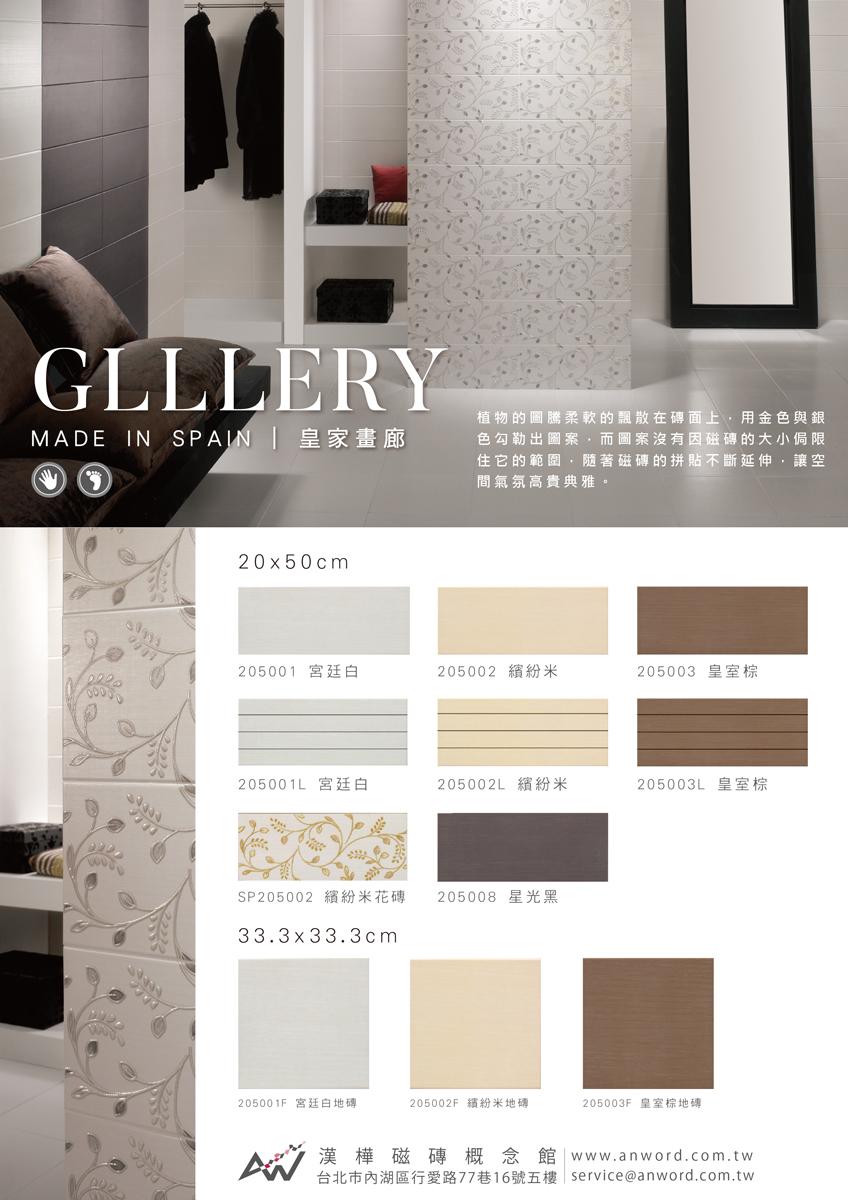 植物的圖騰柔軟的飄散在磚面上,用金色與銀色勾勒出圖案,而圖案沒有因磁磚的大小侷限住它的範圍,隨著磁磚的拼貼不斷延伸,讓空間氣氛高貴典雅。