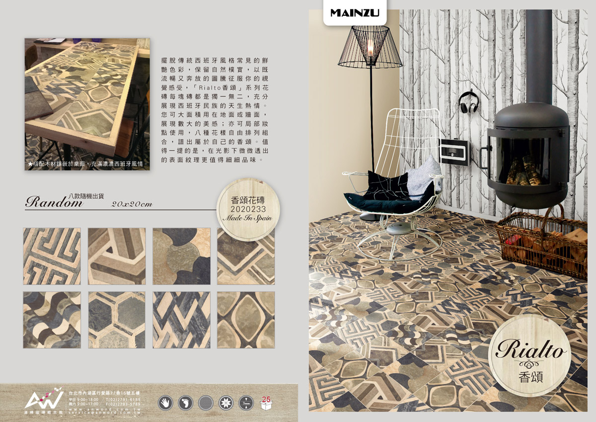 擺脫傳統西班牙風格常見的鮮艷色彩,保留自然樸實,以既流暢又奔放的圖騰征服你的視覺感受,「Rialto香頌」系列花磚每塊磚都是獨一無二,充分展現西班牙民族的天生熱情。您可大面積用在地面或牆面,展現數大的美感;亦可局部妝點使用,八種花樣自由排列組合,譜出屬於自己的香頌。值得一提的是,在光影下微微透出的表面紋理更值得細細品味。