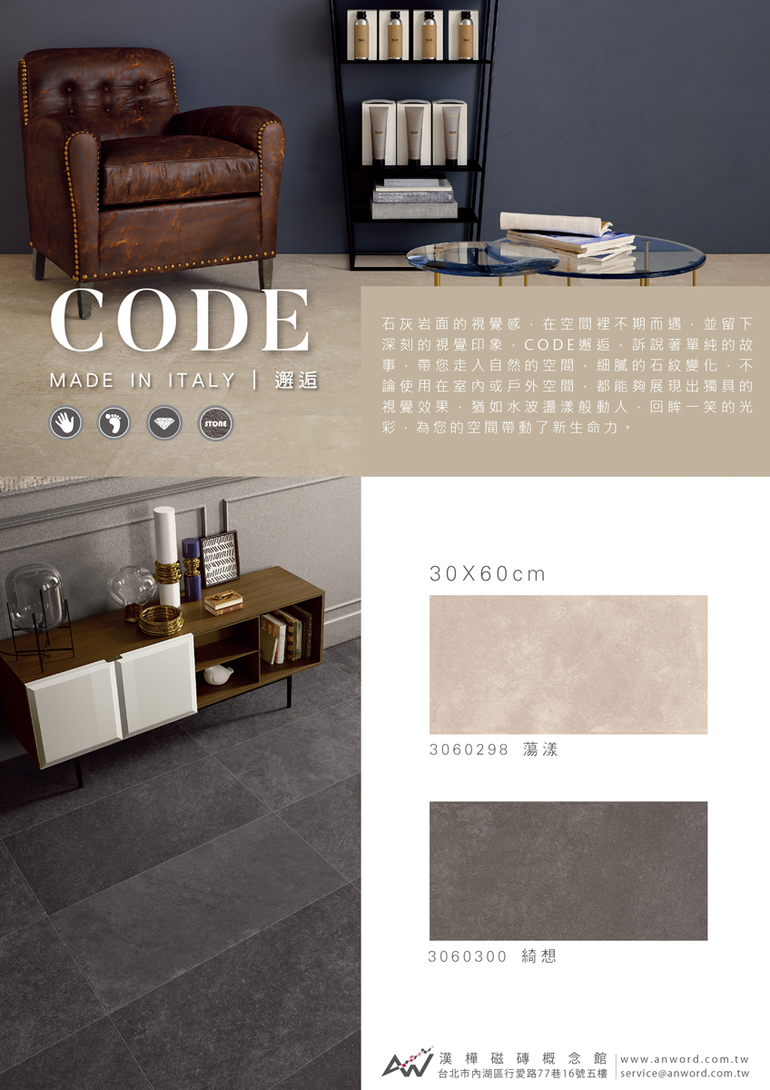 石灰岩面的視覺感,在空間裡不期而遇,並留下深刻的視覺印象,CODE邂逅,訴說著單純的故事,帶您走入自然的空間,細膩的石紋變化,不論使用在室內或戶外空間,都能夠展現出獨具的視覺效果,猶如水波盪漾般動人,回眸一笑的光彩,為您的空間帶動了新生命力。