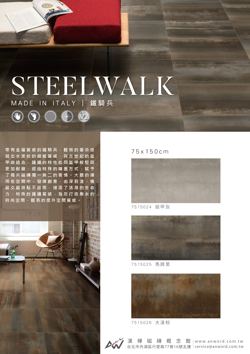 帶有金屬質感的鐵騎兵,輕微的暈染造就出水波紋的細膩質感,與古世紀的盔甲做結合,鐵鏽的特性如同盔甲般堅固更加耐磨,經由特殊的噴墨方式,賦予了每片磁磚獨一無二的表情。大膽的運用在空間中,發揮創意,由深到淺,橫縱交錯拼貼不設限,增添了活潑的生命力,特殊的鐵鏽質感,為您打造雋永的時尚空間,輕易的提升空間質感。